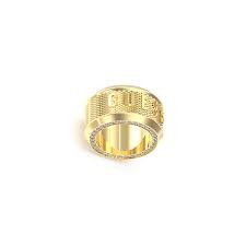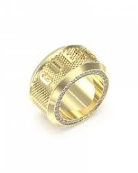 Anillo Guess para hombre en acero dorado de la colección Lion King con circonitas y el nombre de la marca grabado.