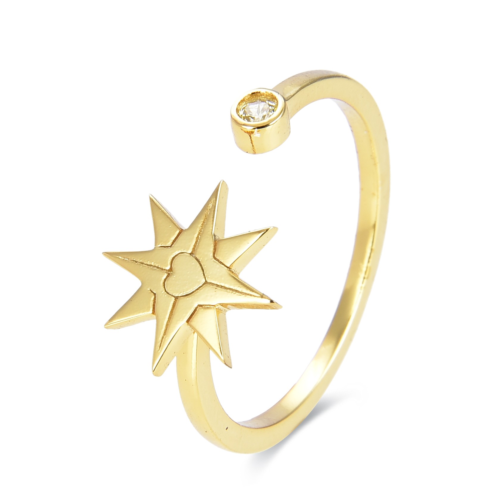 elaborado en plata de ley 925 con un brillante, cálido y duradero baño de oro amarillo de 18 quilates. Llama la atención su delicado y refinado diseño en el que predomina un aro pulido brillante dorado decorado en su parte central por una apertura ajustable con dos extremos distintos, uno con una estrella y el otro con una circonita trasparente engastada brillante.
