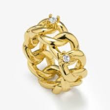 Anillo Radiant Gaga Chain. Fabricado en acero 316L hipoalérgico IP dorado acabado brillante. Montura con forma de eslabones barbados de 10mm de ancho decorado con circonita. Talla 14