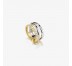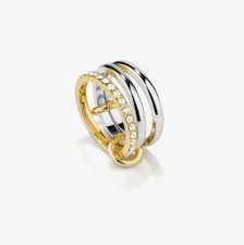 Fabricado en acero inoxidable con un acabado bicolor en tonos dorado y plateado, esta pieza destaca por su estructura envolvente de anillos entrelazados, creando un efecto visual dinámico y armonioso. Las circonitas engastadas en uno de los anillos añaden un toque de brillo sutil, elevando su elegancia sin perder su esencia moderna.