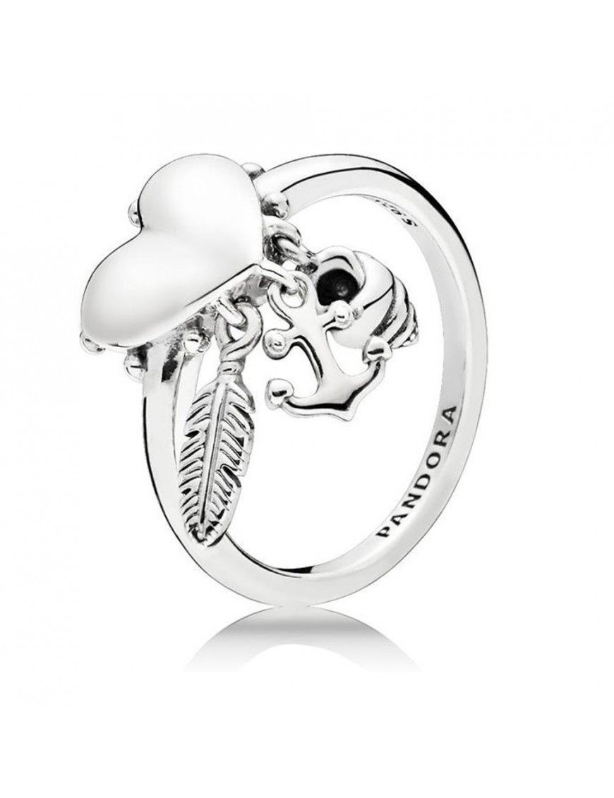 Anillo Pandora Plata Símbolos Este anillo de Pandora, para mujer, está elaborado en plata de ley, 925mls, está formado por un corazón del que cuelgan tres símbolos espirituales (pluma, ancla y caracola). Tiene una talla Pandora 54 que corresponde a una 14