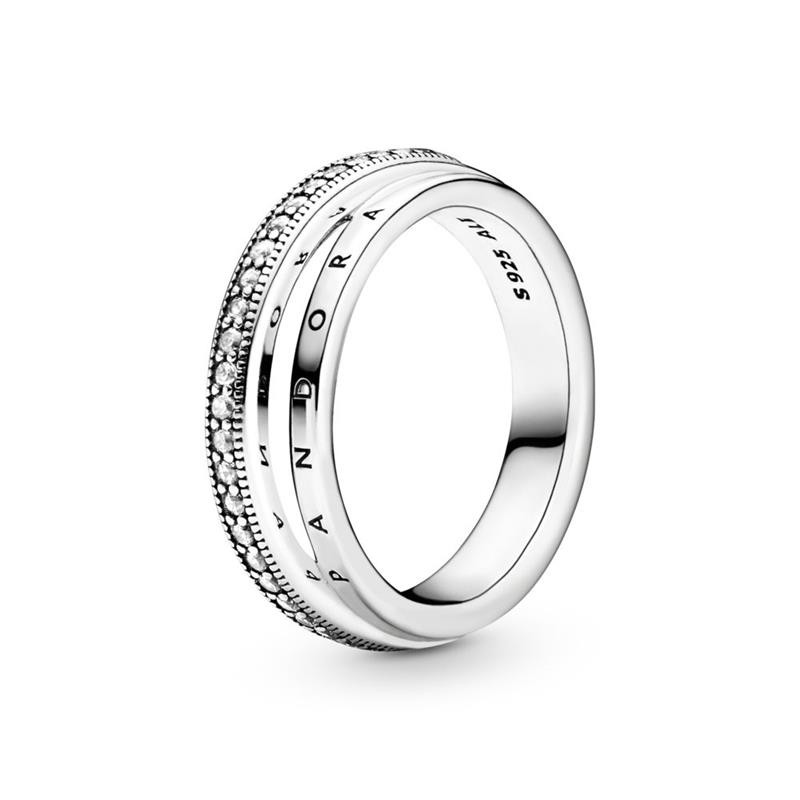 Anillo Pandora Triple Banda en pavé fabricado en plata de primera ley y adornado con múltiples circonitas en una de sus bandas. Este anillo se compone de 3 bandas una de ellas compuesta de circonitas, una intermedia en tamaño fino con el Logo de Pandora y la última más ancha también con el logo Pandora.