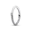 Anillo Pandora Me Dual blanco y Pavé para mujer de la colección Verano 2023 fabricado en plata de primera ley compuesto por 2 hileras de circonitas blancas engastadas en pavé en una mitad del aro y la otra mitad es lisa. En su parte central encontramos una circonita cúbica brillante de mayor tamaño que el resto