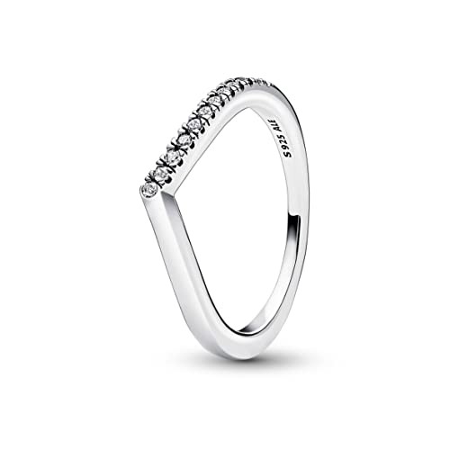 Haz realidad todos tus deseos con este delicado Anillo Deseo Mitad Brillante, mitad forrado con 12 circonitas cúbicas de talla brillante redondas con engastes en garra sobre una banda de plata de primera ley. Simple pero elegante, este anillo en forma de hueso de la suerte se puede llevar solo como una declaración brillante, o combinarlo con otros anillos apilables de Pandora para crear un look único e individual.