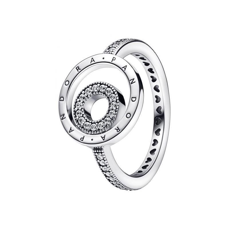 Anillo Pandora para mujer fabricado en plata de primera ley compuesto en su parte superior por 2 piezas circulares, una de ellas con el grabado PANDORA y otro en su interior compuesto de circonitas blancas. Su aro está compuesto por circonitas engastadas en pavé.