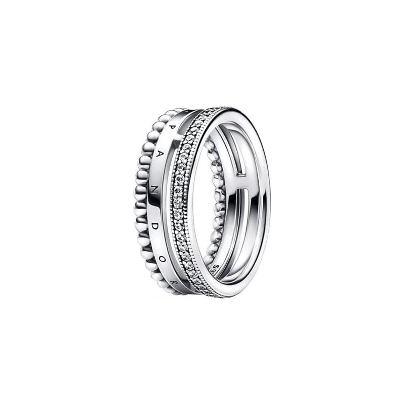 Anillo Pandora para mujer fabricado en plata de primera ley compuesto por un triple aro, uno de ellos compuesto por circonitas blancas engastadas en pavé. El aro central es liso con el grabado del logo PANDORA. Por último un últmo aro compuesto pro bolitas de plata.