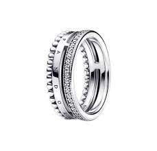 Anillo Pandora Signature Logo Pavé y Cuentas. Fabricado en plata de primera ley, este anillo presenta un look de varias texturas con bandas de contraste de esferas y pavé. El logo de Pandora se ha grabado en la banda central.