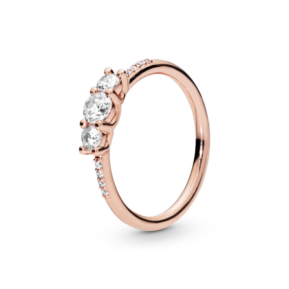 Anillo Pandora Elegancia Brillante en Rose, una aleación única de metales, con plata de baja aleación y cobre con un recubrimiento de oro de segunda ley y adornado con circonitas cúbicas transparentes. Talla 56