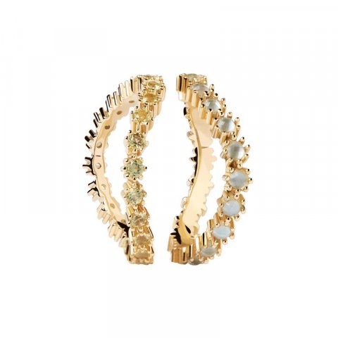 Fabricadas en Plata de Ley 925 con un baño de oro de 18K, destacan las piedras engarzadas en un original engaste de 8 garras. Material: Plata de Ley 925 Acabado: Baño en Oro de 18k Piedras: Cristales azules NácarCirconita verde lima Diámetro Piedras: 2 mm Ancho Total Anillo: 2,5 mmPeso: 4,12g