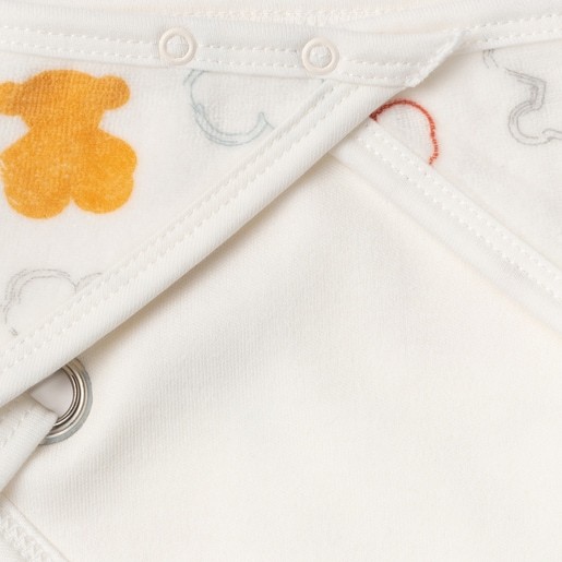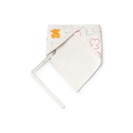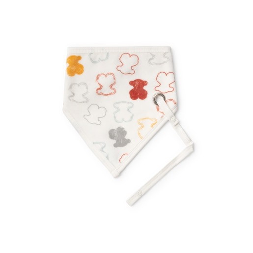 Bandana con porta-chupete Baby TOUS en forma de triángulo de suave tejido aterciopelado osos multicolor. Cierre con botones a presión para regular la medida. Porta-chupete de cinta con broche. COMPOSICIÓN: 80%Algodón 20%Poliéster. Color crudo. Certificado OEKO/TEX*. Fabricado en la UE.