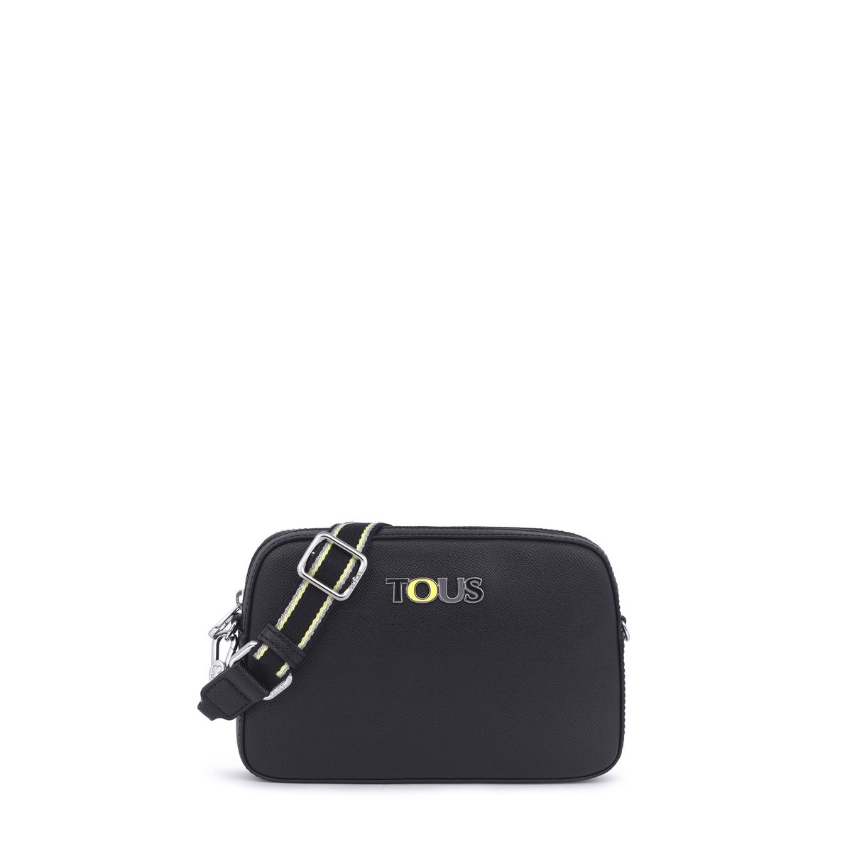 Bolso bandolera-riñonera TOUS colección New Essence de vinilo con efecto saffiano de color Negro. Cierre con cremallera. Apliques personalizados en tono dorado pálido. Asa de bandolera o riñonera ajustable y extraíble. Bolsillo interior plano. Medidas: 15x23x5 cm.