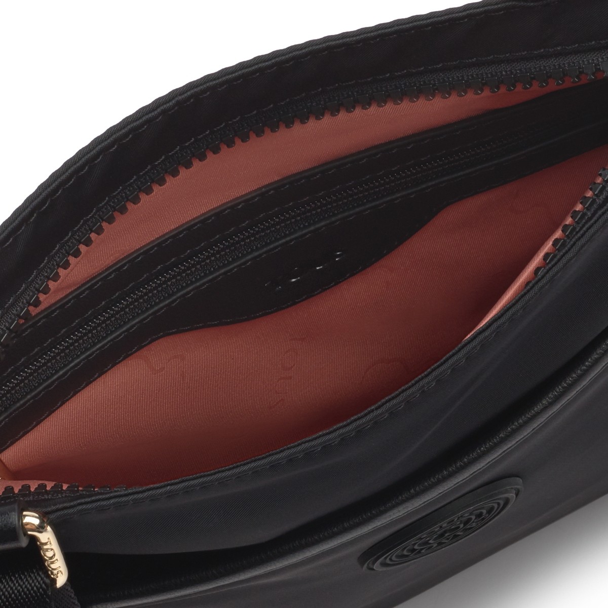 Bolso bandolera TOUS colección New Doromy de nylon en color Negro. Cierre con cremallera. Apliques contrastados. Asa de bandolera ajustable. Dos bolsillos interiores planos y uno con cremallera . Un bolsillo exterior con cremallera. Medidas: 24x26x8,52 cm.