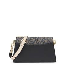 Bolso bandolera mediano Kaos Icon de poliuretano y lona con estampado Kaos en color negro. Cierre de cremallera. En el interior contiene dos compartimentos. Bolsillo interior abierto y bolsillo exterior abierto. Asa bandolera ajustable y extraíble. Medidas (alto x ancho x fondo): 16 x 26 x 9,5 cm.