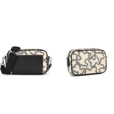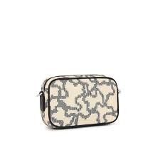 Bolso bandolera reporter TOUS Kaos Pix Soft de poliéster reciclado con estampado en color beige y negro. También incorpora detalles de piel sintética. Bandolera con cierre de cremallera, bolsillo frontal abierto, bolsillo interior abierto y asa ajustable y extraíble. Medidas (alto x ancho x fondo): 13,5 x 22 x 7 cm.