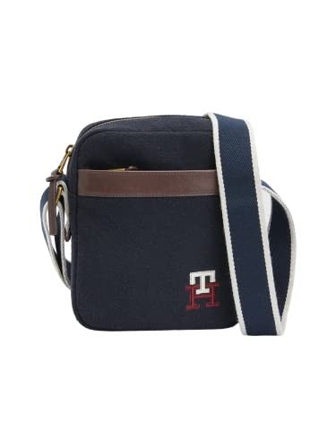 Este bolso reporter pequeño es un diseño práctico y refinado de estilo universitario con un monograma TH bordado y detalles metálicos.