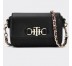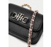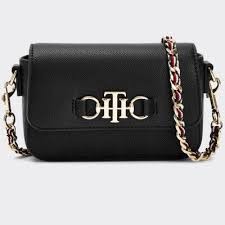 Este coqueto bolso de tamaño compacto presenta una bandolera de cadena con cinta distintiva entrelazada y elegantes detalles en metal pulido.