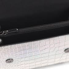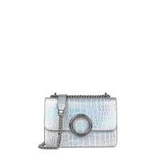 Bolsa TOUS Bandolera pequeña de la colección Audree Wild de vinilo efecto piel de crocodrilo en color iriscente. Bolsa cuenta con asa larga tipo cadena. Dentro hay 2 compartimentos y un bolsillo interior con cremallera. Cierre con botone magnetico. Medidas: 22 x 15 x 9 cm