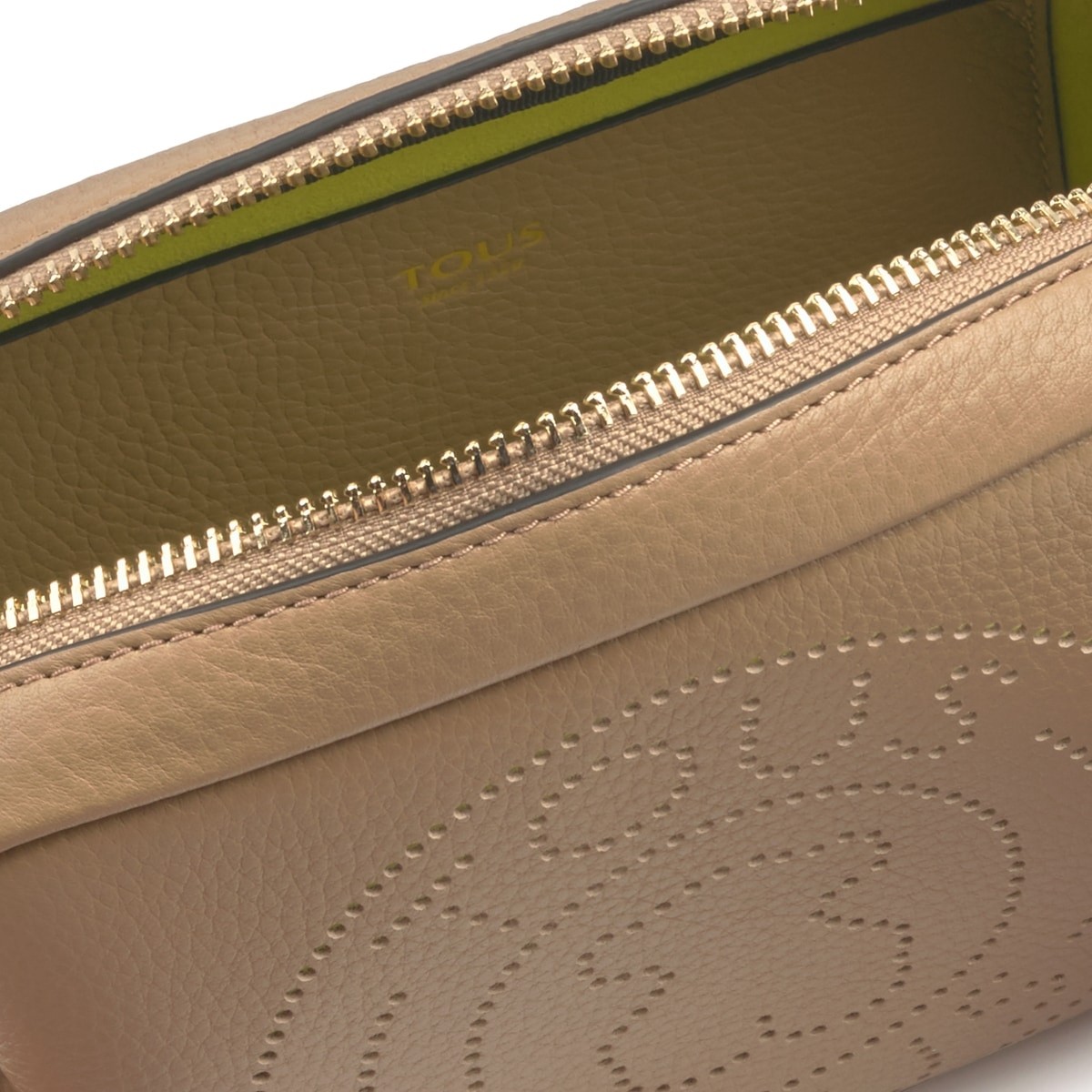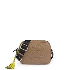 Bolso bandolera pequeña TOUS colección Leissa de piel en color piedra. Cierre con cremallera. Apliques personalizados en tono dorado pálido. Asa de bandolera ajustable. Bolsillo interior plano. Medidas: 15x21x7 cm.