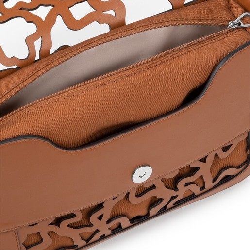 Bolso bandolera TOUS Amaya Kaos Shock de piel sintética con troquelado Kaos en color marrón. Incorpora una solapa y el cierre es con botón magnético. El asa de bandolera es ajustable. Incluye una bolsa interior de poliéster con cierre de cremallera. Esta bolsa se puede poner o quitar gracias a los botones a presión que incorpora. Medidas (alto x ancho x fondo): 20 x 28 x 8 cm.