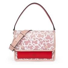 Bolso TOUS Bandolera mediana de la colección Audree de vinilo efecto piel en rojo y vinilo transparente en color rosa con estampado Tous. Bolso cuenta con asa del hombo y asa larga ajustable y extraíble. Dentro hay 2 compartimentos y un bolsillo interior con cremallera y otro plano, exterior. Cierre con boton magnetico. Medidas: 25,5 x 18,5 x 11 cm