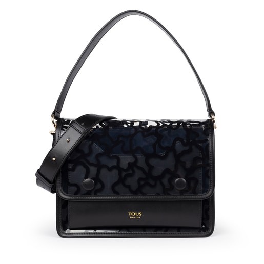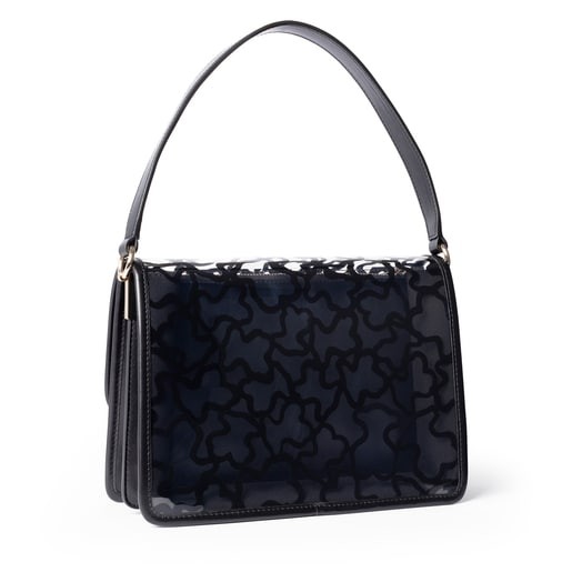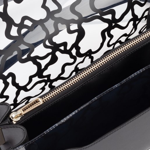 Bolso TOUS Bandolera mediana de la colección Audree de vinilo efecto piel en negro y vinilo transparente con estampado Tous en color negro. Bolso cuenta con asa del hombo y asa larga ajustable y extraíble. Dentro hay 2 compartimentos y un bolsillo interior con cremallera y otro plano, exterior. Cierre con boton magnetico. Medidas: 25,5 x 18,5 x 11 cm