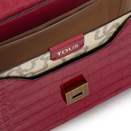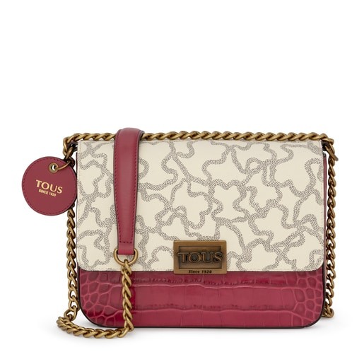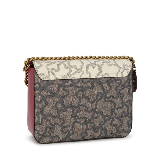 Bolso bandolera mediana Tous de la colección Kaos Legacy de piel vacuna en su base de color burdeos, mezclada con vinilo estampado de osos en beige. Cierre con solapa y botón a presión. Asa larga de bandolera tipo cadena, regulable y no extraíble. Bolso cuenta con un bolsillo interior plano. Medidas: 8 x 24 x 20 cm.