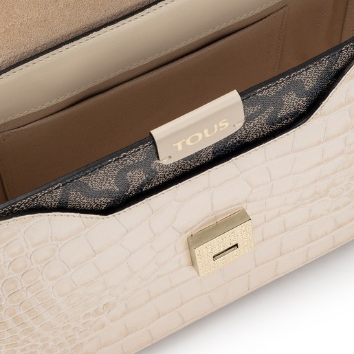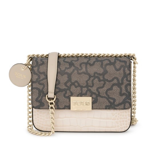 Bolso bandolera mediana Tous de la colección Kaos Legacy de piel vacuna en su base de color beige, mezclada con vinilo estampado de osos en beige y gris. Cierre con solapa y botón a presión. Asa larga de bandolera tipo cadena, regulable y no extraíble. Bolso cuenta con un bolsillo interior plano. Medidas: 8 x 24 x 20 cm.