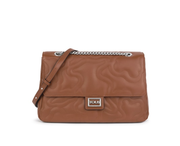 Bolso bandolera mediana con solapa TOUS de la colección Kaos Dream de poliuretano acolchado en forma de osos con acabado efecto piel en color marrón. Correa larga de bandolera tipo cadena ajustable. Cierre con botón magnético. Un bolsillo interior con cremallera. Medidas: 12 x 32 x 21 cm.