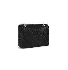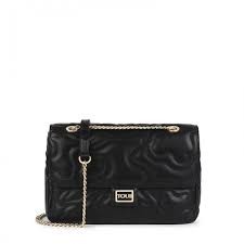 Bolso bandolera mediana con solapa TOUS de la colección Kaos Dream de poliuretano acolchado en forma de osos con acabado efecto piel en color negro. Correa larga de bandolera tipo cadena ajustable. Cierre con botón magnético. Un bolsillo interior con cremallera. Medidas: 12 x 32 x 21 cm.