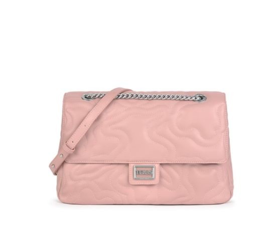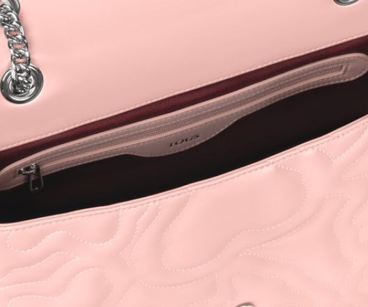 Bolso bandolera mediana con solapa TOUS de la colección Kaos Dream de poliuretano acolchado en forma de osos con acabado efecto piel en color rosa. Correa larga de bandolera tipo cadena ajustable. Cierre con botón magnético. Un bolsillo interior con cremallera. Medidas: 12 x 32 x 21 cm.