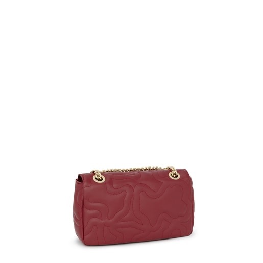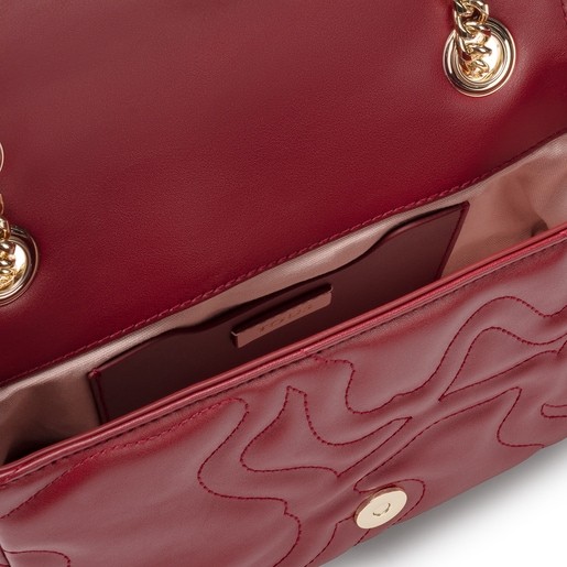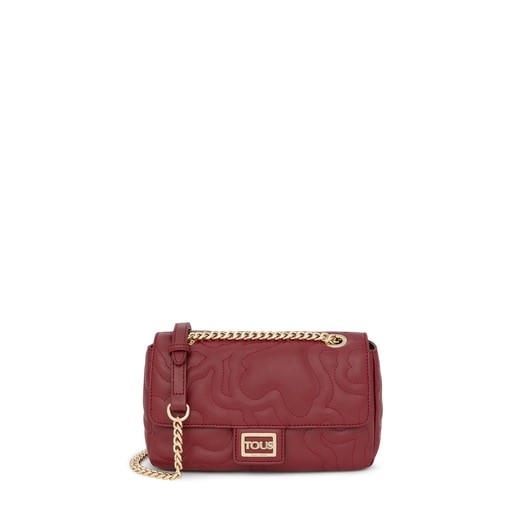Bolsa bandolera pequeña con solapa TOUS de la colección Kaos Dream de poliuretano acolchado en forma de osos con acabado efecto piel en color burdeos. Correa larga de bandolera tipo cadena ajustable. Cierre con botón magnético. Un bolsillo interior plano. Medidas: 8 x 25 x 15 cm.