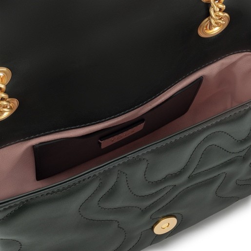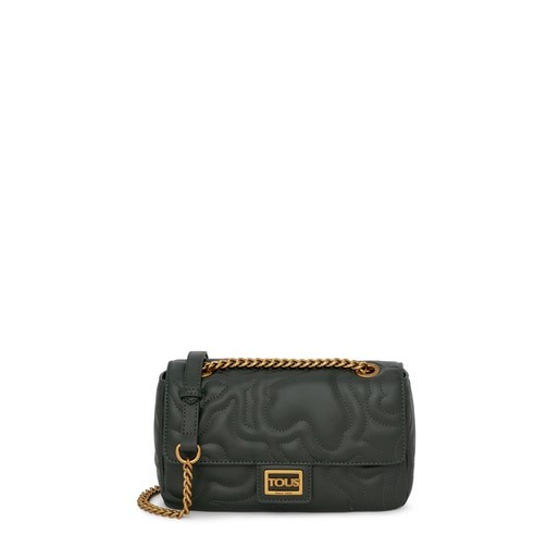 Bolso bandolera pequeña con solapa TOUS de la colección Kaos Dream de poliuretano acolchado en forma de osos con acabado efecto piel en color verde. Correa larga de bandolera tipo cadena ajustable. Cierre con botón magnético. Un bolsillo interior plano. Medidas: 8 x 25 x 15 cm.