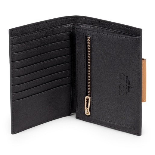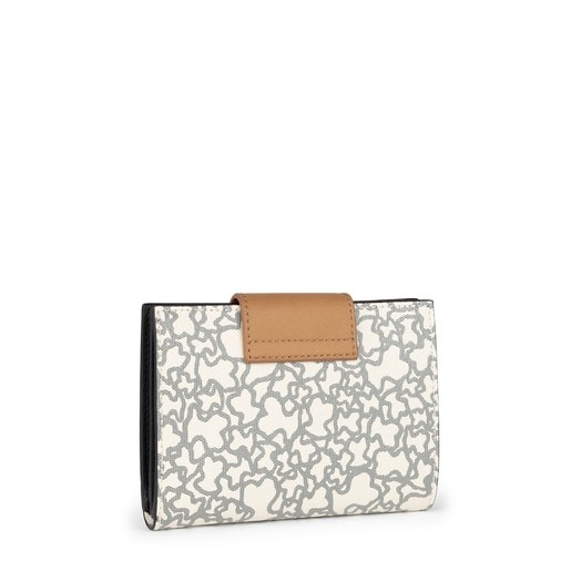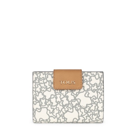 Billetera pequeña TOUS Kaos Mini de lona hidrofuga combinado con vinilo efecto piel en beige y negro. Cierre con botón a presión. Interior: 8 departamentos para tarjetas, 4 departamentos para varios y 1 departamento con cremallera. Medidas: 12,5 x 11 x 2,5 cm.