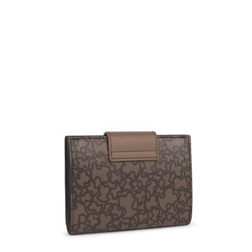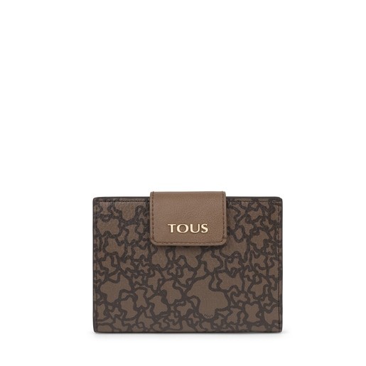 Billetera pequeña TOUS Kaos Mini de lona hidrófuga combinado con vinilo efecto piel en marrón. Cierre con botón a presión. Interior: 8 compartimentos para tarjetas, 4 compartimentos para pertenencias varias y 1 compartimento con cremallera. Medidas: 12,5 x 11 x 2,5 cm.