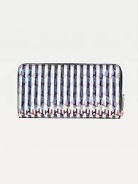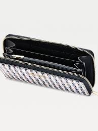 Esta cartera de tamaño grande presenta un diseño con efecto holográfico que, según la luz, hace apreciar rayas o un estampado de monogramas TH.