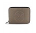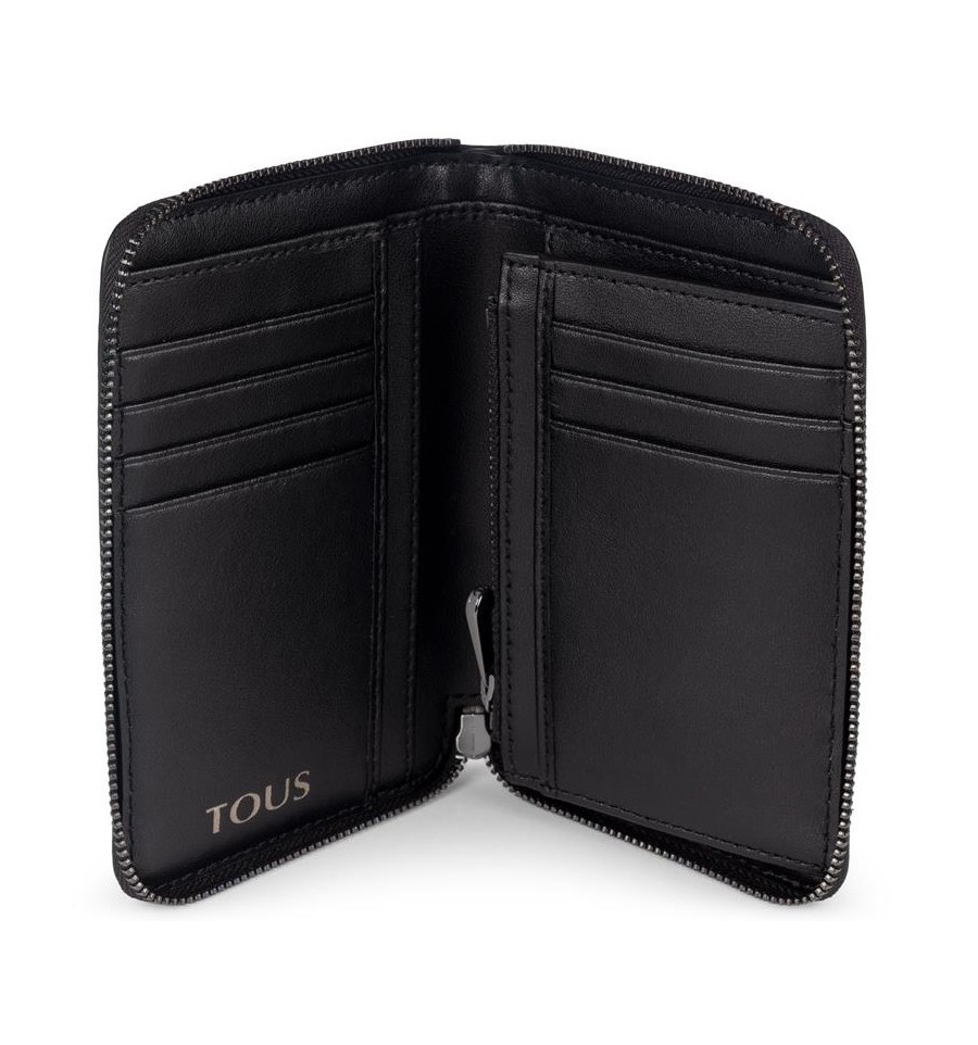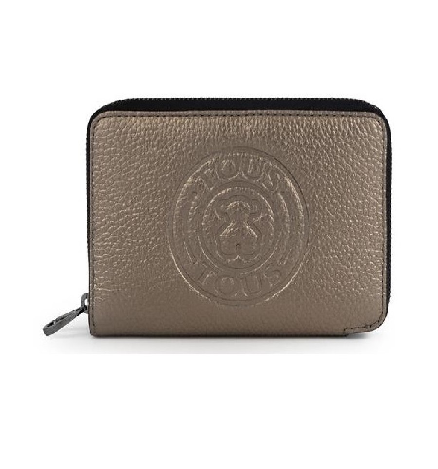 Billetera TOUS para mujer en tamaño pequeño de la colección Leissa en color Bronce metalizado. Está fabricada en vinilo efecto piel con cierre de cremallera. En su interior posee un compartimento para billetes y 7 compartimentos para tarjetas y 3 planos, también consta de un bolsillo con cremallera para monedas y otro sin cremallera.