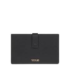 Billetera medianaTous Essential de vinilo efecto safiano combinado con vinilo efecto piel en negro. Cierre con botón a presión. Interior con 1 bolsillo con cremallera, 10 departamentos principales para tarjetas y 1 departamento grande para billetes. Medidas: 18,5 x 13 x 2,5 cm.