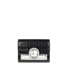 Billetera pequeña TOUS de la colección Audree Wild de vinilo efecto piel de crocodrilo en color blanco y negro. Cierre con 2 bototones a presión. Interior: bolsillo para monedas, departamentos para tarjetas y grande compartimento para billetes. Lleva una anilla de metal en color dorado. Medidas: 9 x 12 x 3,5 cm.