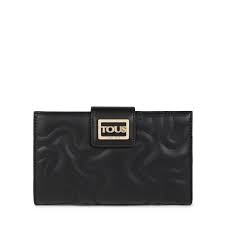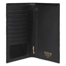 Billetera grande TOUS de la colección Kaos Dream de poliuretano acolchado en forma de osos con acabado efecto piel en color negro. Cierre con botón a presión. Interior: 9 compartimentos para tarjetas, 3 compartimentos grandes para otras pertenencias y un compartimento con cremallera. Medidas: 12 x 19 x 3 cm.