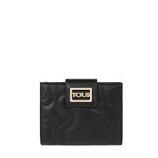 Billetera mediana TOUS de la colección Kaos Dream de poliuretano acolchado en forma de osos con acabado efecto piel en color negro. Cierre con botón a presión. Interior: 8 compartimentos para tarjetas, 2 compartimentos grandes para otras pertenencias y un compartimento con cremallera. Medidas: 12 x 14 x 3 cm.