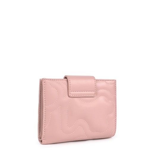 Billetera mediana TOUS de la colección Kaos Dream de poliuretano acolchado en forma de osos con acabado efecto piel en color rosa. Cierre con botón a presión. Interior: 8 compartimentos para tarjetas, 2 compartimentos grandes para diferentes pertenencias y un compartimento con cremallera. Medidas: 12 x 14 x 3 cm.