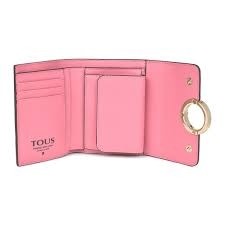 Billetera pequeña TOUS de la colección Audree de vinilo efecto piel en color marrón y rosa. Cierre con 2 bototones a presión. Interior: bolsillo para monedas, departamentos para tarjetas y grande compartimento para billetes. Lleva una anilla de metal en color dorado. Medidas: 9 x 12 x 3,5 cm.