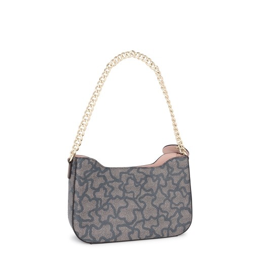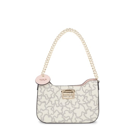 Bolso baguette TOUS Kaos Legacy de lona hidrófuga con estampado Kaos en color beige y negro. También incorpora detalles en piel vacuna de color rosa pálido. El cierre es con placa giratoria de metal. Viene con una asa de hombro de cadena metálica en color dorado. Incluye un pequeño bolsillo interior abierto para tarjetas. Medidas (alto x ancho x fondo): 17 x 26 x 7 cm.