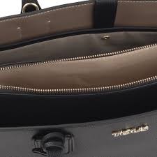 Bolso city grande TOUS de la colección Essential de vinilo efecto safiano combinado con vinilo efecto piel en color negro. El bolso cuenta con 4 grandes compartimentos, uno de ellos con cierre de cremallera y botón magnético. Asa de bandolera ajustable y desmontable y correas de hombro. Colgante decorativo incluido. Medidas: 40 x 28 x 13 cm.
