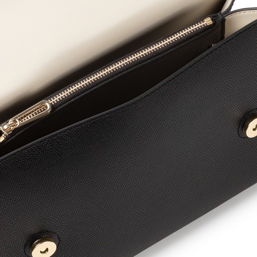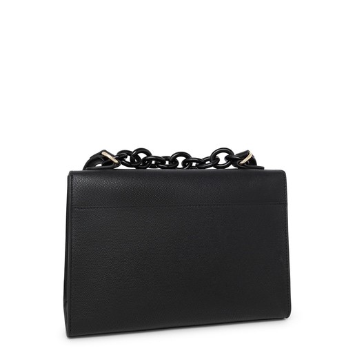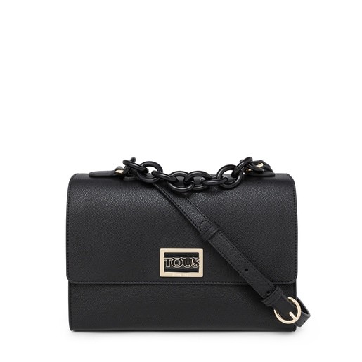Bolso city mediano TOUS Funny de piel sintética con textura saffiano en color negro. Incorpora una solapa y el cierre es con dos botones magnéticos. Cuenta con un bolsillo exterior abierto en la parte trasera. En el interior hay dos grandes compartimentos divididos por un bolsillo con cremallera. El asa de hombro es ajustable. Incluye una bonita cadena decorativa. Medidas (alto x ancho x fondo): 19 x 27 x 11 cm.
