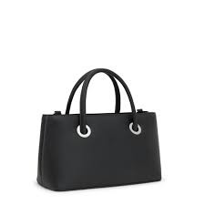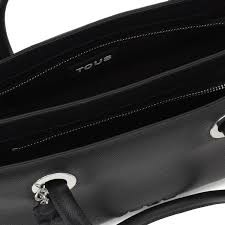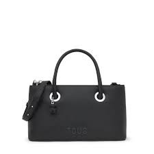 Bolso City mediano TOUS Poppy de poliuretano en color negro. Dos compartimentos con cierre de cremallera. Bolsillo interior abierto. Asas fijas de mano y asa bandolera ajustable y desmontable. Medidas (alto x ancho x fondo): 18 x 30,5 x 15 cm.