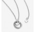 Collar con Colgante Círculo Familiar Siempre se presenta con tres círculos entrelazados en el colgante, dos de ellos en plata de primera ley pulida y un tercero embellecido con brillantes circonitas cúbicas en pavé. El cierre se presenta con un pequeño disco con forma de corazón decorado con el monograma de la O coronada de Pandora en un lateral. La longitud del collar es ajustable.