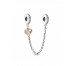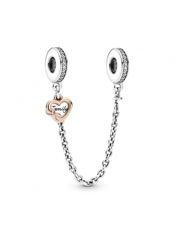 Cadena De Seguridad Pandora Corazón Familiar 789541C01-05, en plata de primera ley 925mls y decorada con una aleación única de metales con un recubrimiento electrolítico en oro rosa de segunda ley de 14kts, circonitas cúbicas transparentes y grabado "Family".