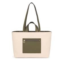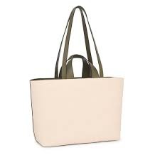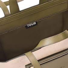 Bolso capazo mediano TOUS Nanda de piel sintética en color beige y caqui. Cierre de cremallera. Un bolsillo frontal abierto y otro con cremallera. Bolsillo interior abierto. Asas fijas de mano y hombro. Medidas (alto x ancho x fondo): 27 x 49 x 14 cm.