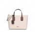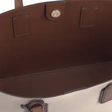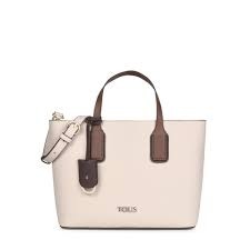 Bolso capazo pequeño TOUS de la colección Essential de vinilo efecto safiano combinado con vinilo efecto piel en color beige y marrón. El bolso cuenta con un compartimento grande. Cierre con botón magnético. Asa de bandolera ajustable y desmontable y asas de mano. Colgante decorativo incluido. Medidas: 37 x 23,5 x 14 cm.